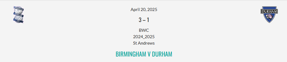 | BIR | BLA | BRI | CHA | DUR | LCL | NEW | POR | SHE | SOU | SUN | |